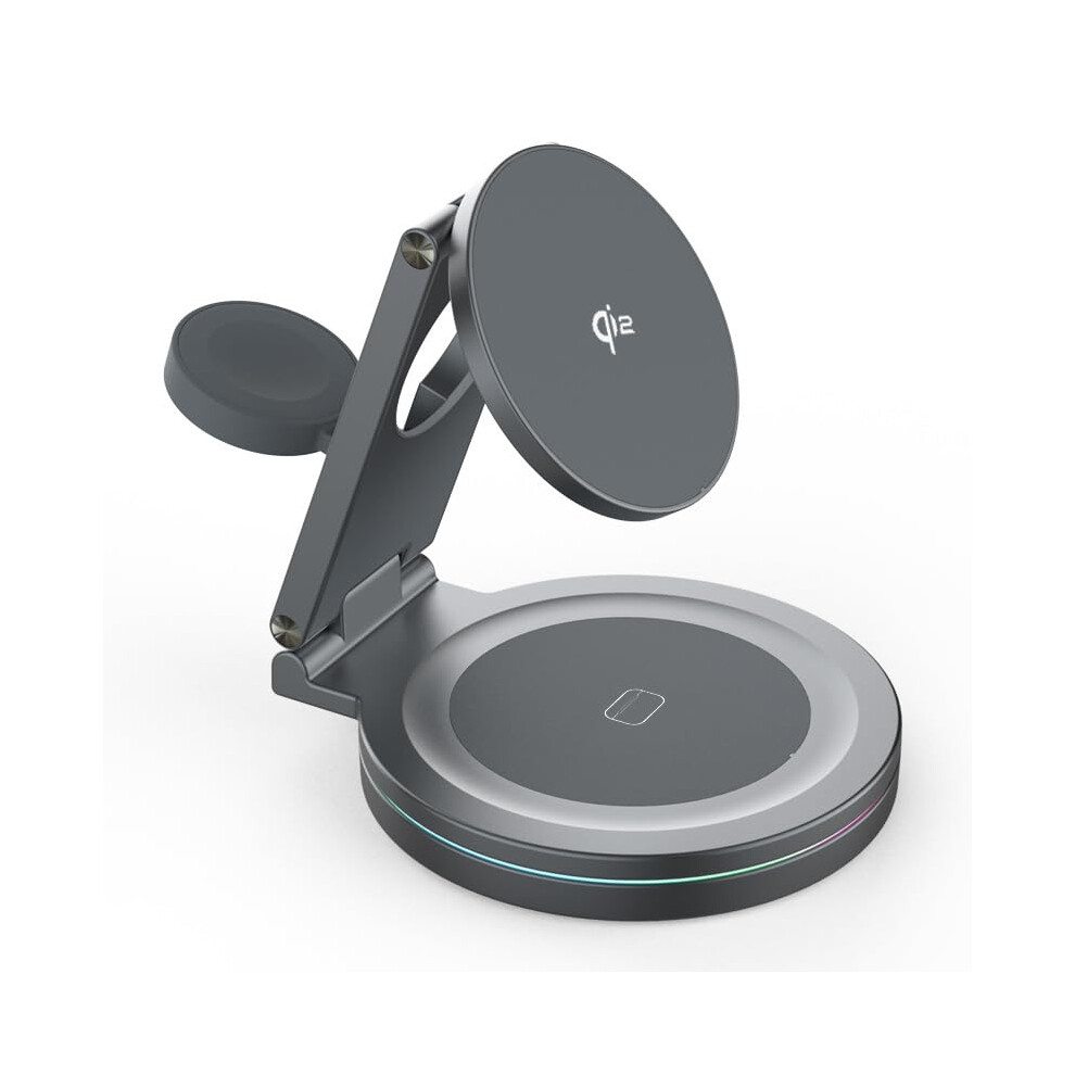 3 in 1 Magnetic Wireless Charging Station for iPhone, Apple Watch and AirPods, 15W Fast Charger Dock, 360 Rotating Foldable Qi2 Stand Gray