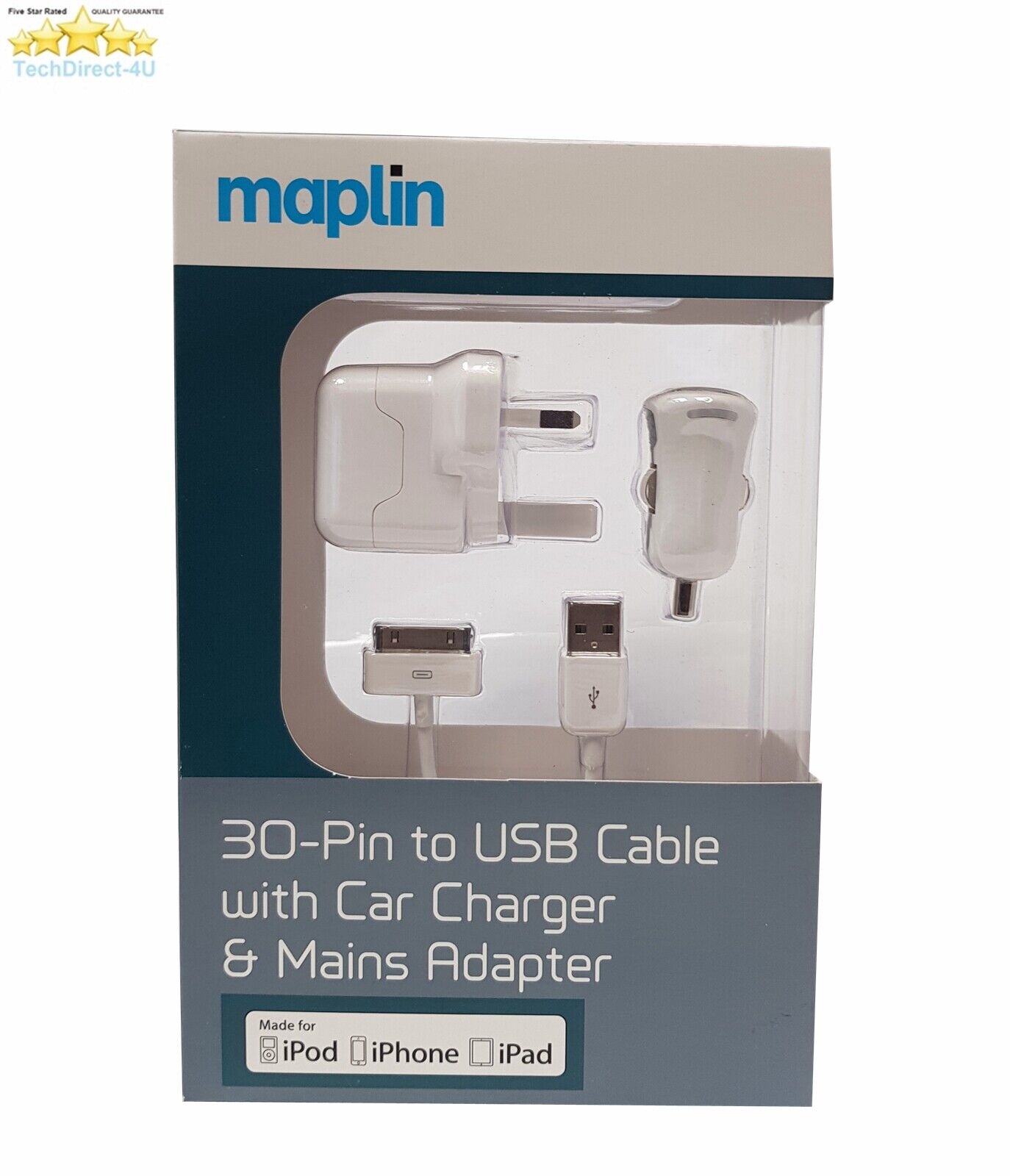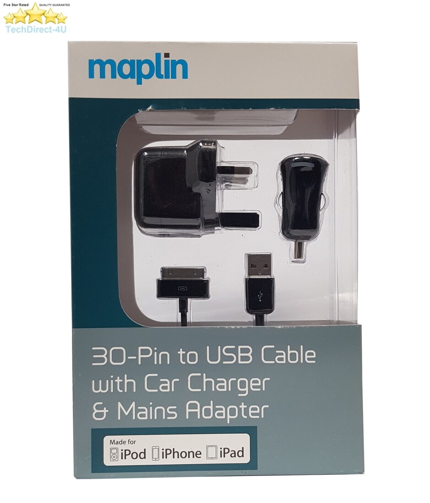 Certified Maplin 30Pin To USB Cable 2.1A Mains & Car Iphone & Ipad Charger Black