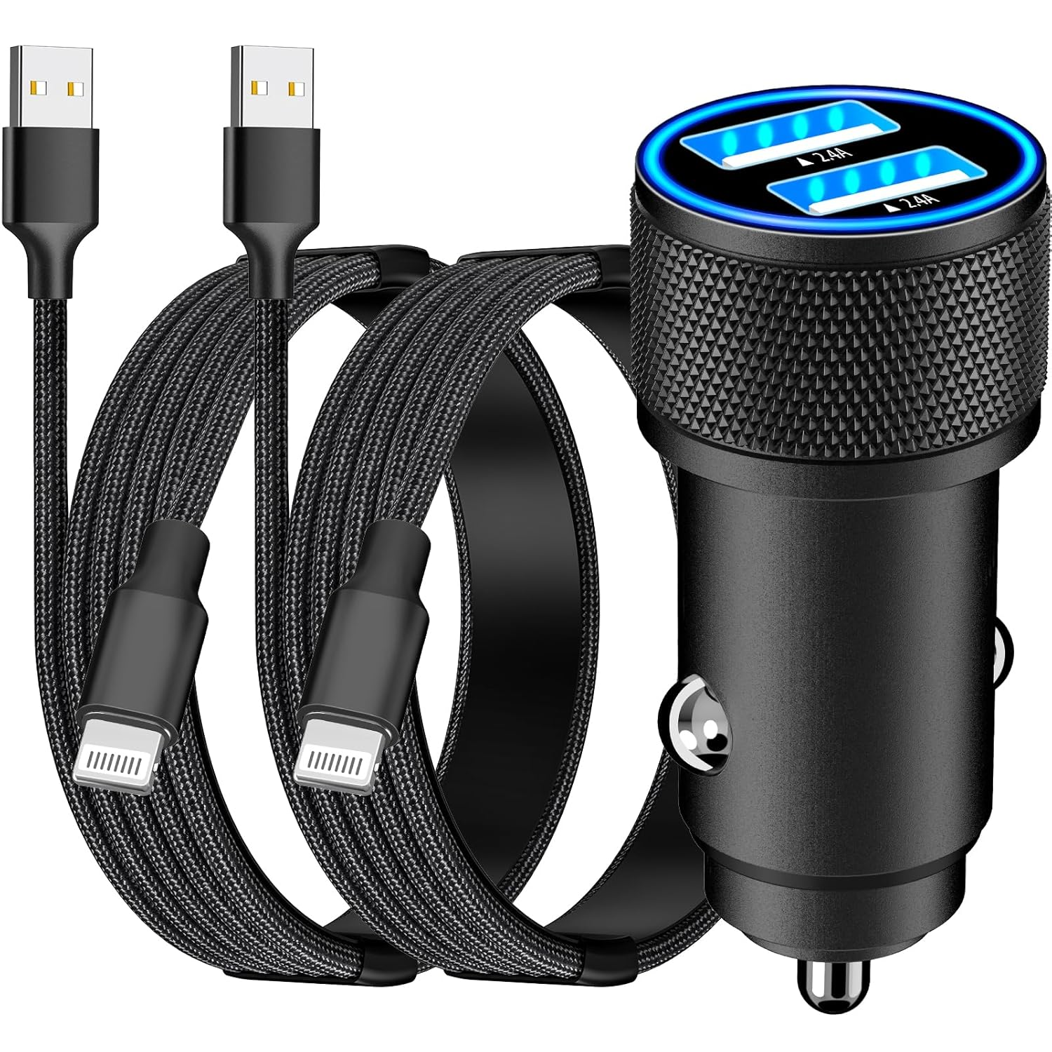 ARCCRA for iPhone Car Charger + 2-Pack USB to Lightnings-Cable, 2-Port 12W Cigarette Lighter Charger for iPhone 14 13 12 11 Pro Max SE XS XR X 8 7 6 SE, iPad, 12V/24V USB Socket