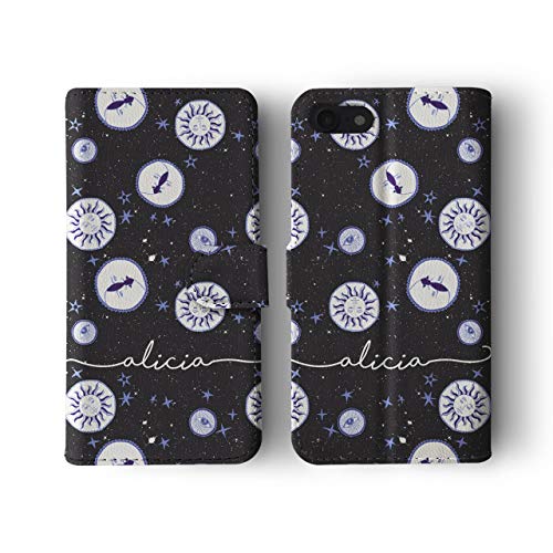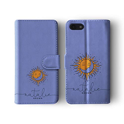 Tirita Personalised Leather Flip Wallet Phone Case with Card Holder Compatible with iPhone 7/8 / SE 2020 / SE 2022 - Spiritual Elements [17 - Blue Sun and Moon]