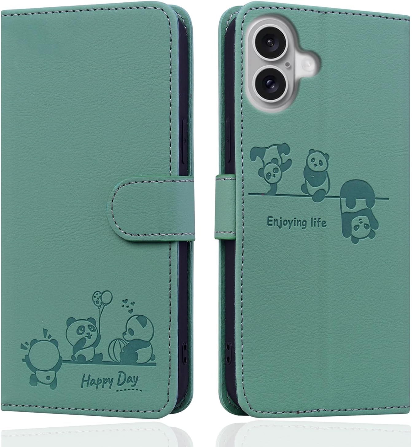 (Green) Case for iphone 16 Plus Holder Cover Wallet Case Card Pocket Flip Folio Embossed Cute Tiger