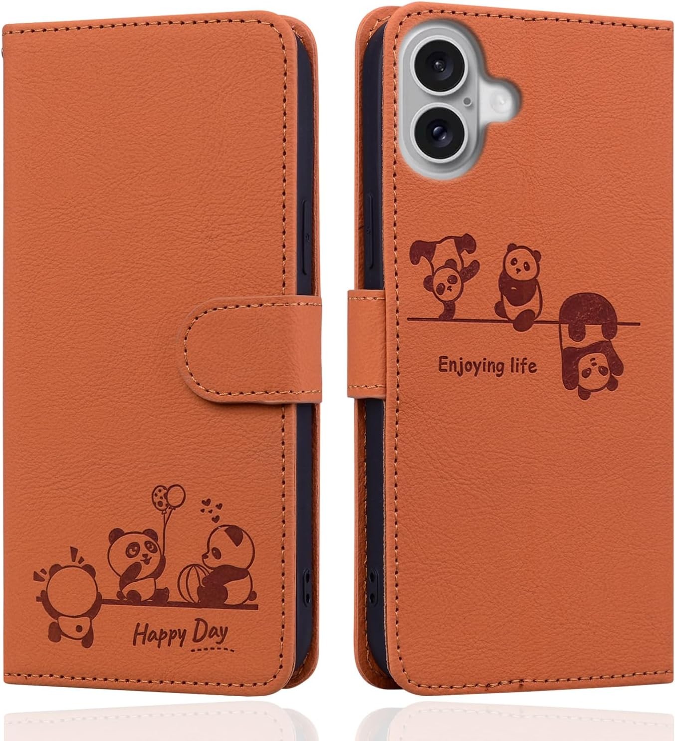 (Brown) Case for iphone 16 Plus Holder Cover Wallet Case Card Pocket Flip Folio Embossed Cute Tiger