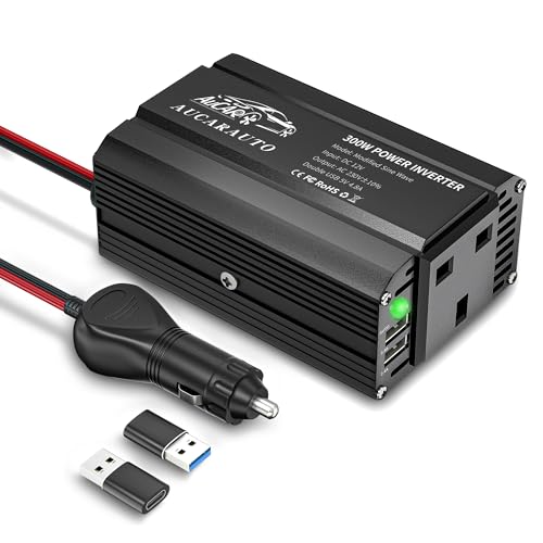 AUCARAUTO 300W Car Power Inverter 12V to 240V / 230V Modified Sine Wave Voltage Converter with USB-A 4.8A Charging Ports, Durable Aluminum Body, Charge Your Laptop, iPhone, Tablet - Black
