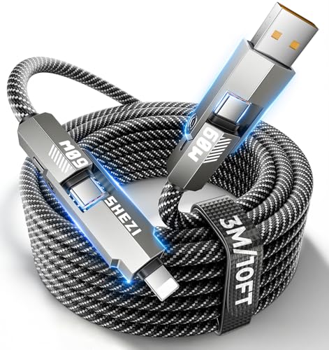 SHEZI 4 in 1 Long Multi Charging Cable, 60W USB C to Compatible With Lightning Cable, Nylon Braided Fast Charging iPhone Charger Cord, USB C Charger Cable for iPhone/Samsung/Carplay/Andriod Auto, 3M