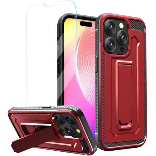 ORETECH for iPhone 15 Pro Max Case, [Tempered Glass Screen Protector] [Built-in Kickstand] [Heavy Duty Protection] 2 in 1 Shockproof Anti-Silp Protective Cover for iPhone 15 Promax Phone Case - Red