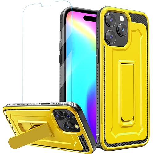 ORETECH for iPhone 15 Pro Max Case, [Tempered Glass Screen Protector] [Built-in Kickstand] [Heavy Duty Protection] 2 in 1 Shockproof Anti-Silp Protective Cover for iPhone 15 Promax Phone Case - Yellow