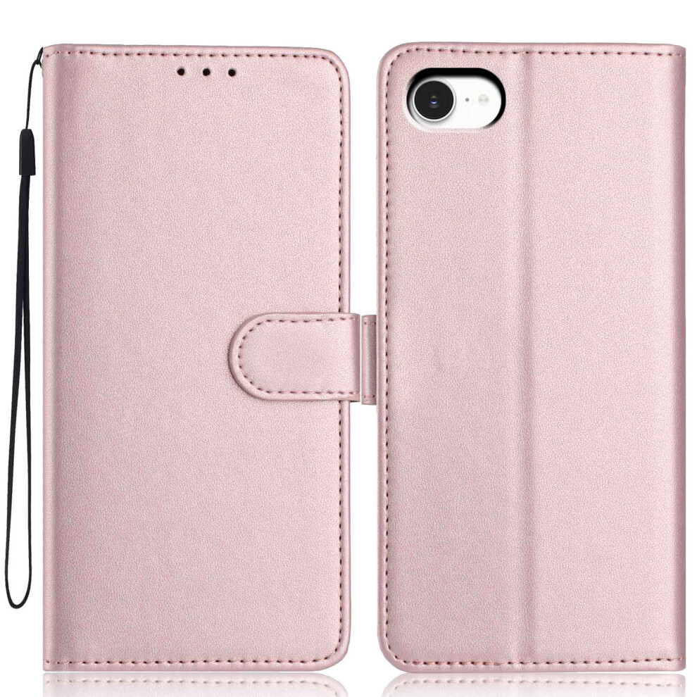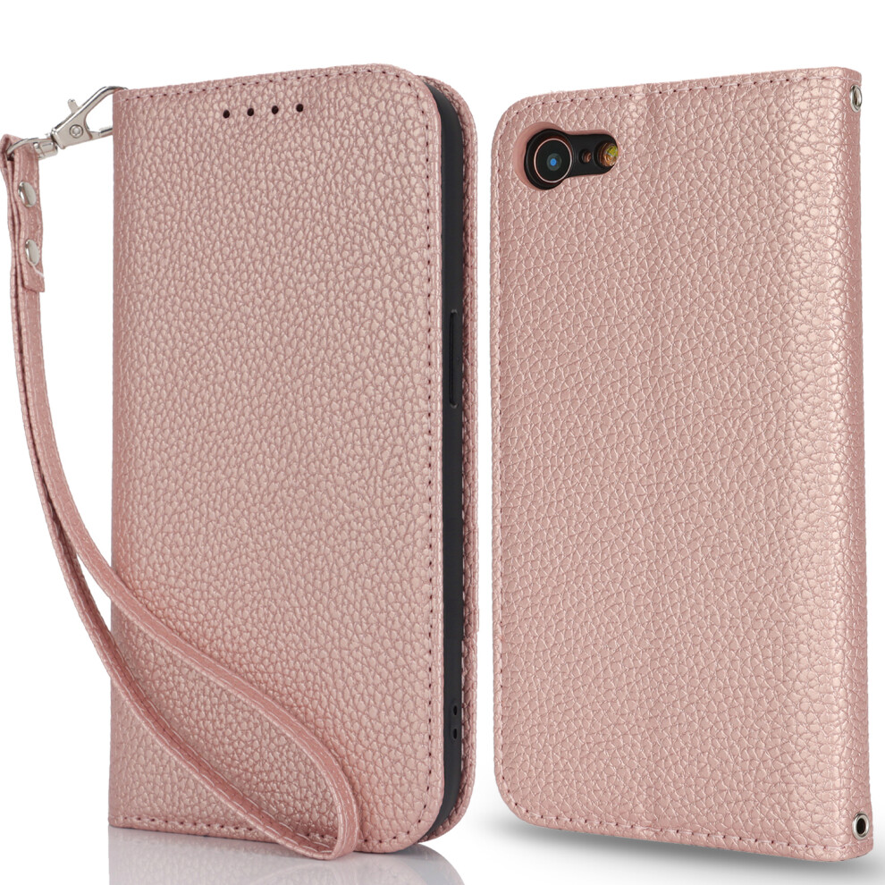 (iPhone SE (2022), Rose Gold) Stand Case for iPhone SE (2022)/(2020)/8/7 Litchi Texture Leather Flip Phone Cover with Strap/Wallet
