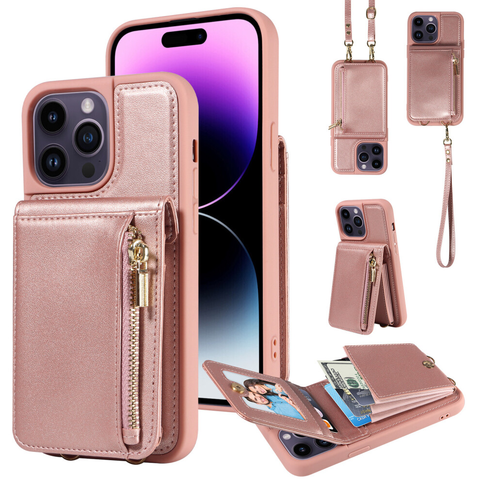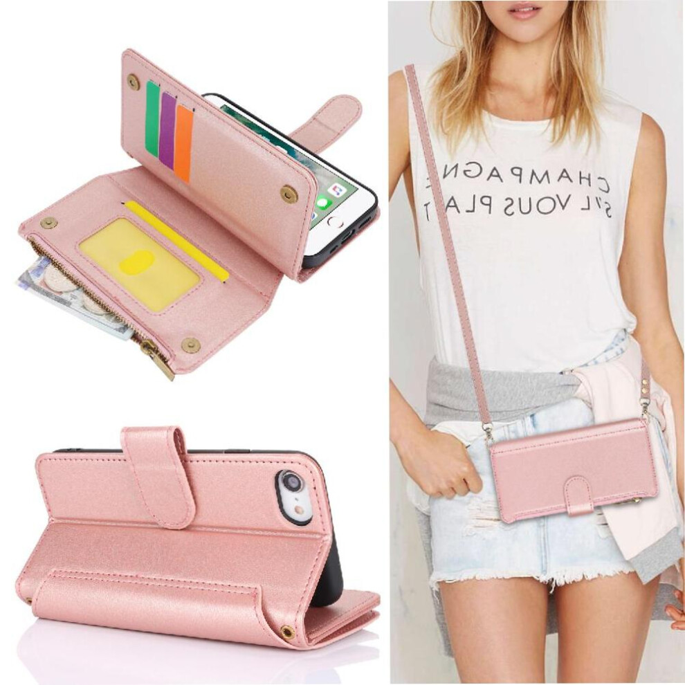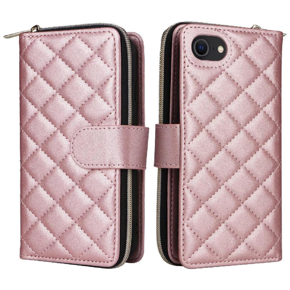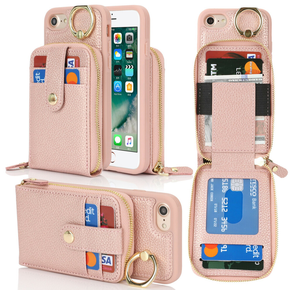 (Rose Gold ) Flip Zipper Case for iphone Se 2020 1 Cash Slot 9 Card Holder Magnetic Closure Kickstand Wrist Strap