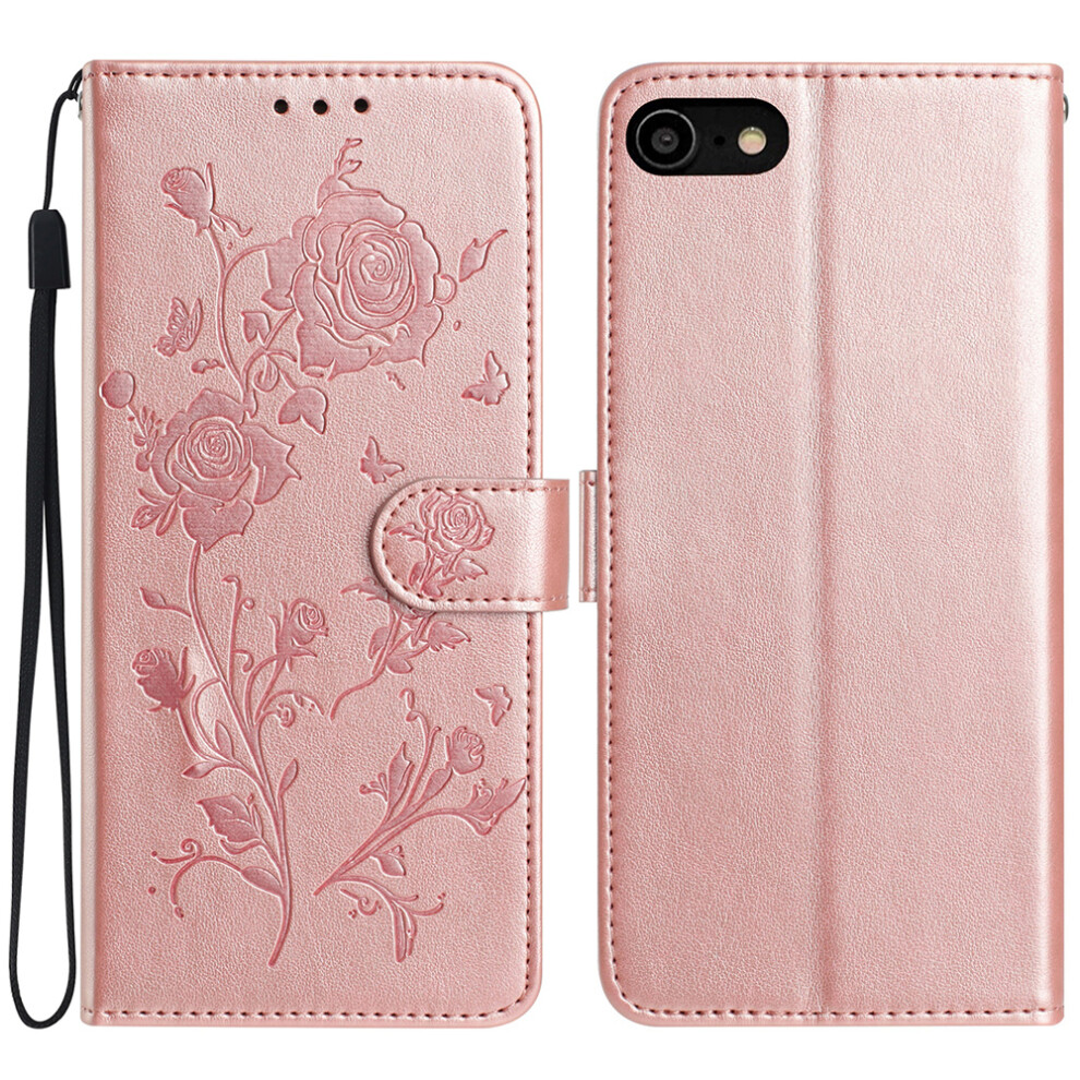 SATURCASE Case for Apple iPhone SE (2020), Butterfly Flower PU Leather Flip Magnet Wallet Stand Card Slots Protective Cover with Hand Strap for Apple iPhone SE (2020) (Rose Gold)
