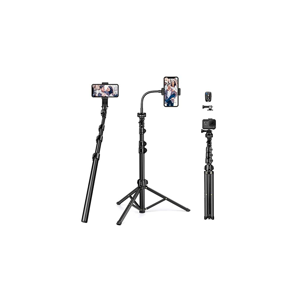 68" Phone Tripod Stand for Smartphone, Gooseneck Aluminum Mobile Phone Tripod for iPhone, Selfie Stick Tripod with Remote Control & Phone Holder for