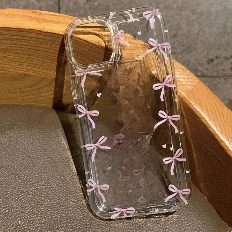 Cute Pink Heart Bow Case for IPhone 16 15 14 13 12 11 Pro Max 13 12Mini XS XR 7 8Plus SE 2022 Shockproof Soft Clear Cases Coque