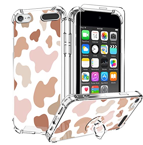 KANGHAR Case for iPod Touch 7/6/5 iPod Touch 5th/6th/7th Generation Pink Brown Soft TPU Bumper | Cute Cow Print, with Screen Protector, Kickstand Ring Holder, Shockproof Cover