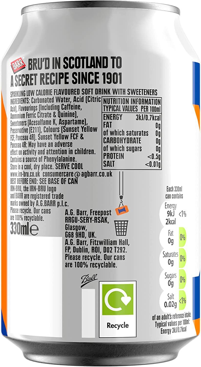 IRN-BRU Sugar-Free Diet, 24 Pack Zero No Sugar & Low Calorie Fizzy Drinks Multipack Cans - 24 x 330ml Cans