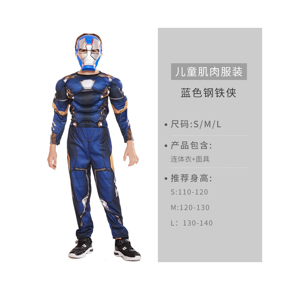 (Children's Muscle Blue Iron Man, L) Avengers Iron Man Spider-Man Captain America Cosplay Halloween Children's Costume Superhero Iron Man