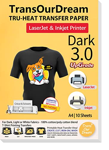 TransOurDream Tru-Transfer Paper Upgraded 3.0 10 Sheets A4 Printable Vinyl for Inkjet&Laser Printer Iron on Heat Transfer Paper for Dark Fabric Transfers Black T-Shirts (Trans-03-10)