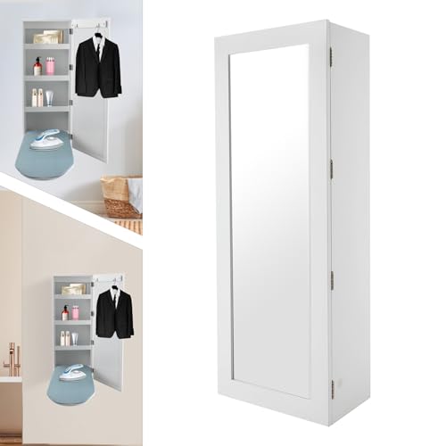 Organizedlife Ironing Board Cabinet, Wall Mounted Storage Cabinet with Mirror, Metal Brackets, Foldable and Hidden for Space Saving, White