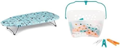 Beldray LA023735SEW Table Top & Desk Ironing Board, 73 x 31cm + Beldray LA028297TQ Ultra Grip Rust Resistant Clothes Pegs with Storage Basket for Washing Line