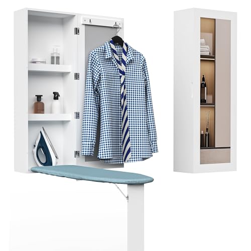 Organizedlife Wall Mounted Ironing Board Cabinet with Iron Storage, Built in Ironing Center, Hanging Ironing Board for Laundry, Folding Leg & Mirror