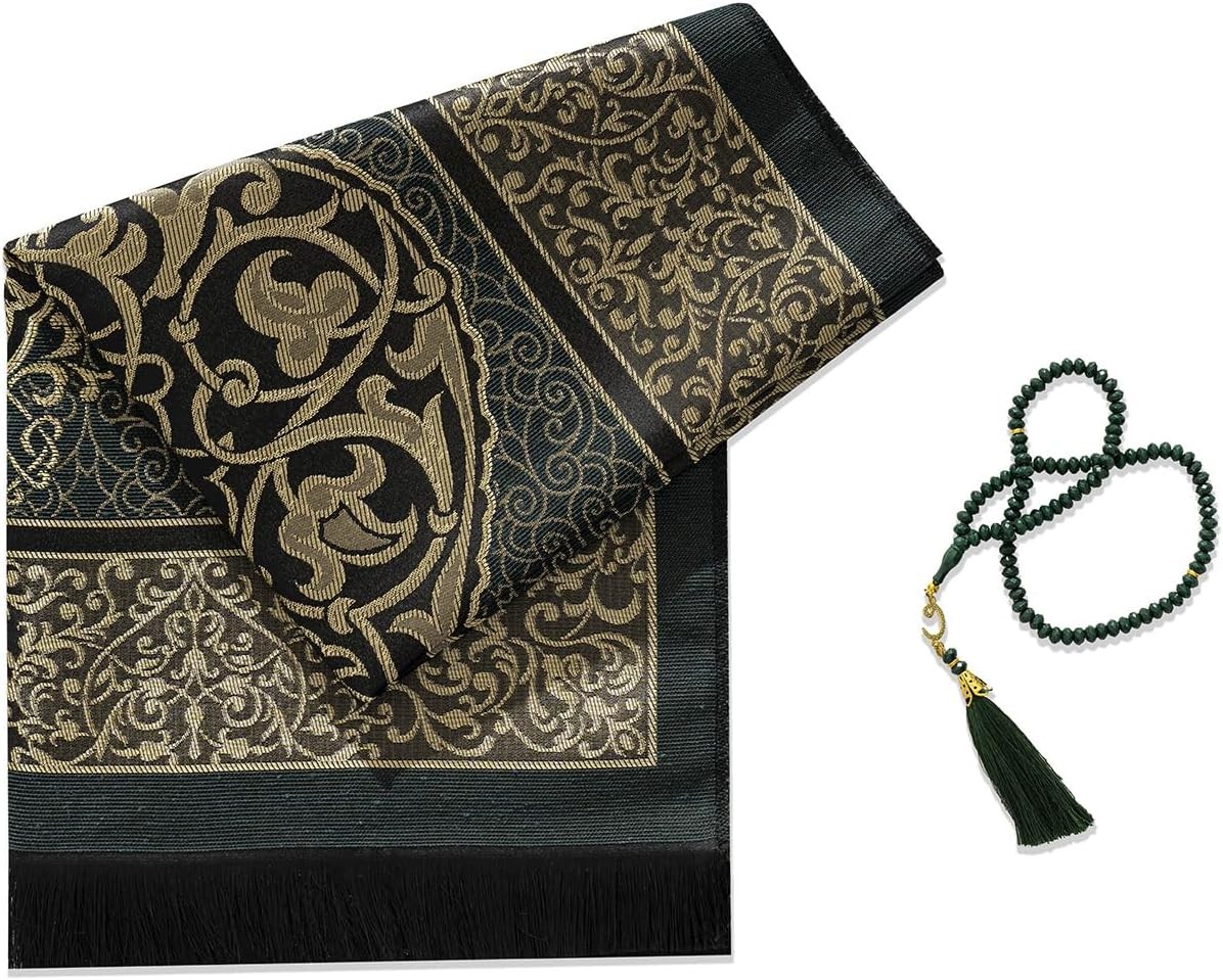 ihvan online Muslim Prayer Rug and Prayer Beads with Elegant Design Cylinder Gift Box, Janamaz, Soft Sajadah, Islamic Gifts Set, Portable Prayers Carpet Mat, Taffeta Fabric, Green