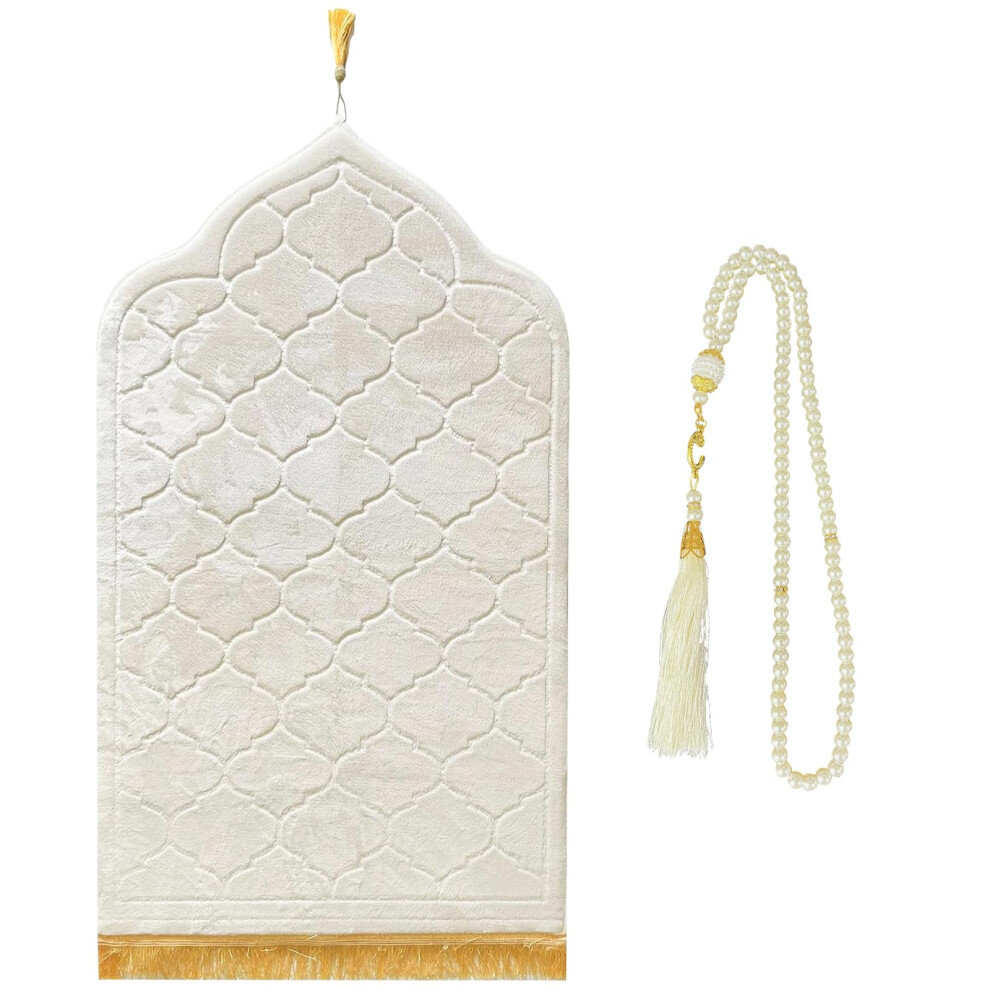 Muslim Prayer Doll Rug and Prayer Beads with Elegant Gift Box | Janamaz | Sajadah | Soft Islamic Prayer Rug | Islamic Gifts Set | Prayer Carpet Mat, Taffeta Fabric, Cream