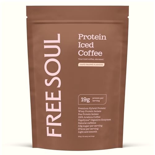 Protein Iced Coffee | 19g Protein & 80mg Caffeine per Serving | Only 97Kcal | Low Calorie + High Protein | Whey Protein & Pea Protein Isolate Blend + Digestive Enzymes | Café Frappé | Free Soul