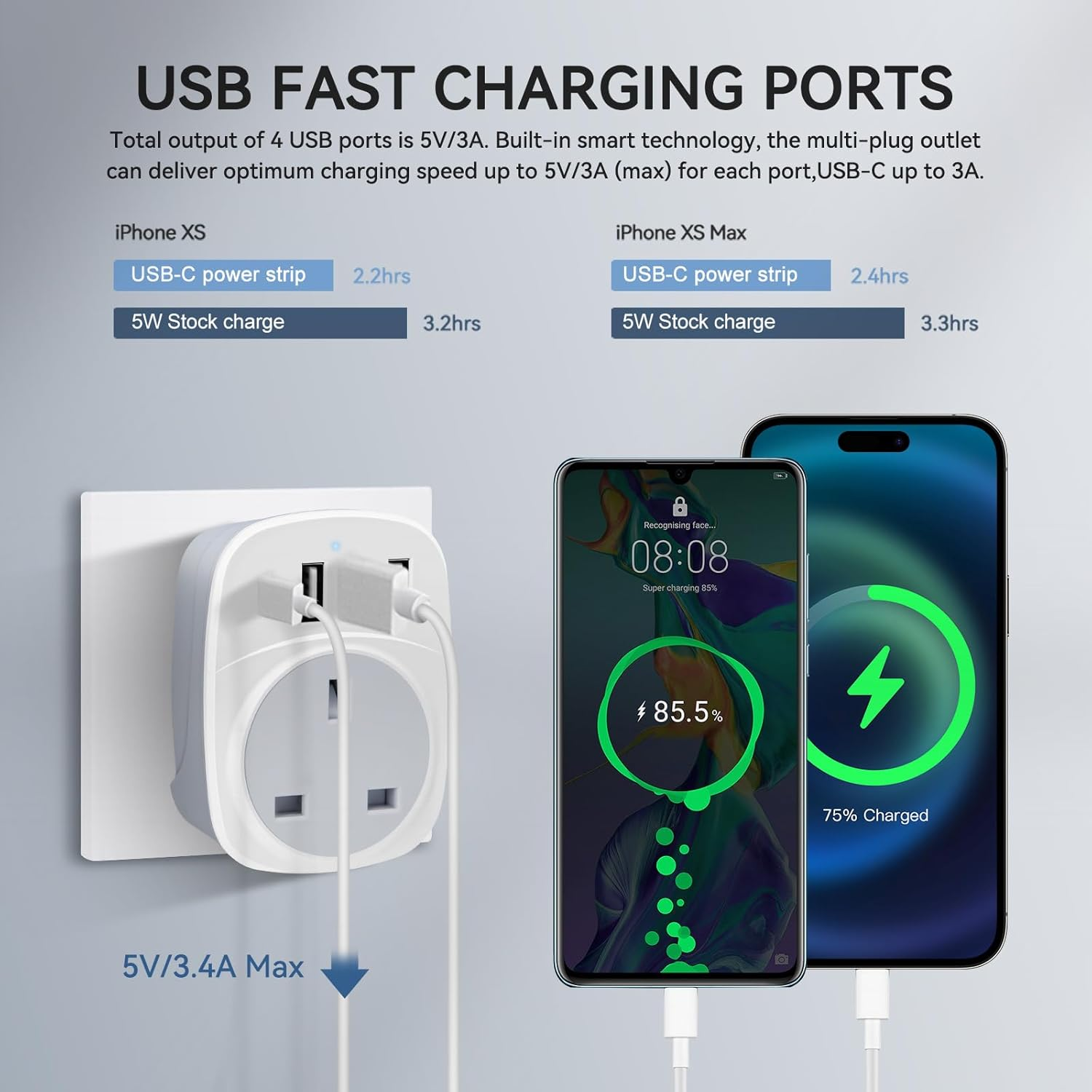 UK to Italy Plug Adapter with 1.5M Extension Cable, BEVA 2 Way 3 USB (2A+1C)...