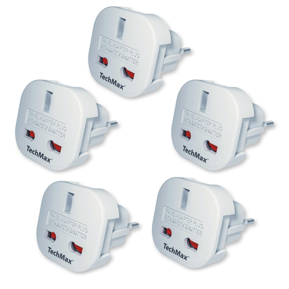 TechMax Pack of 5 UK to European Plug Adapter Type G to Type C,E,F for France, Spain, Turkey, Italy, Greece, Portugal, Germany, Poland, Asia - 3 Pin to 2 Pin Travel Adapter (White)