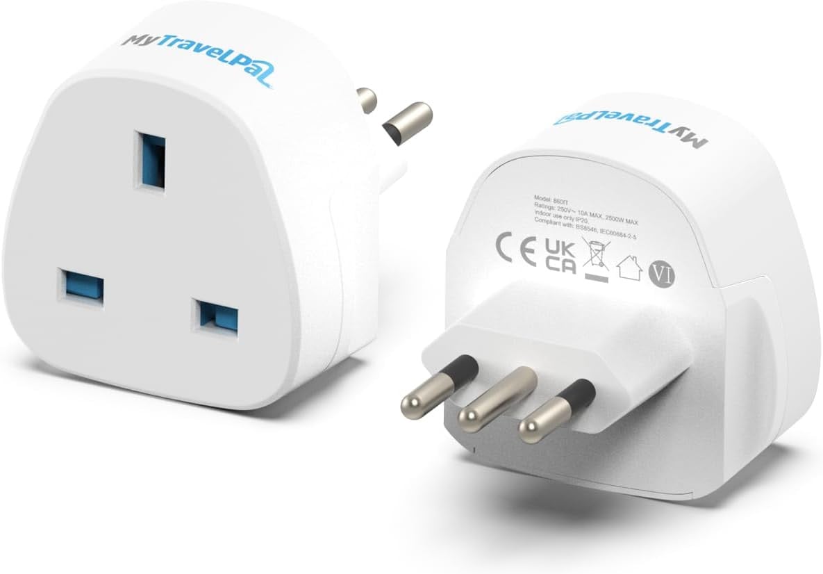2 Pack MyTravelPal UK to Italy Travel Plug Adapter - Type L for Italy, Chile, Vatican City & More