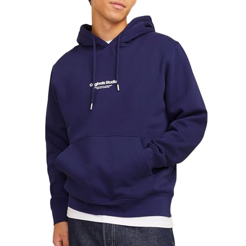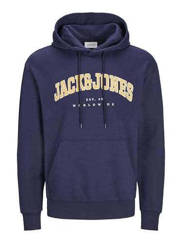 JACK & JONES Men's Hoodie with Adjustable Drawstring Bold Logo Print Design Fleece Lining Kangaroo Pocket Sweatshirt for Men, Navy Colour, Size- S