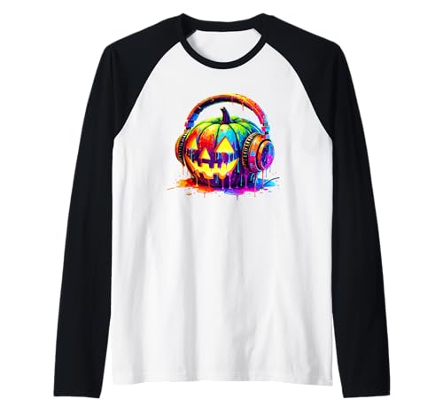 Splash Art Pumpkin Halloween Jack-o'-Lantern Headphones Raglan Baseball Tee