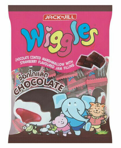 24 x 6g. Jack n Jill Wiggles Chocolate Coated Marshmallow Strawberry Jam Filling