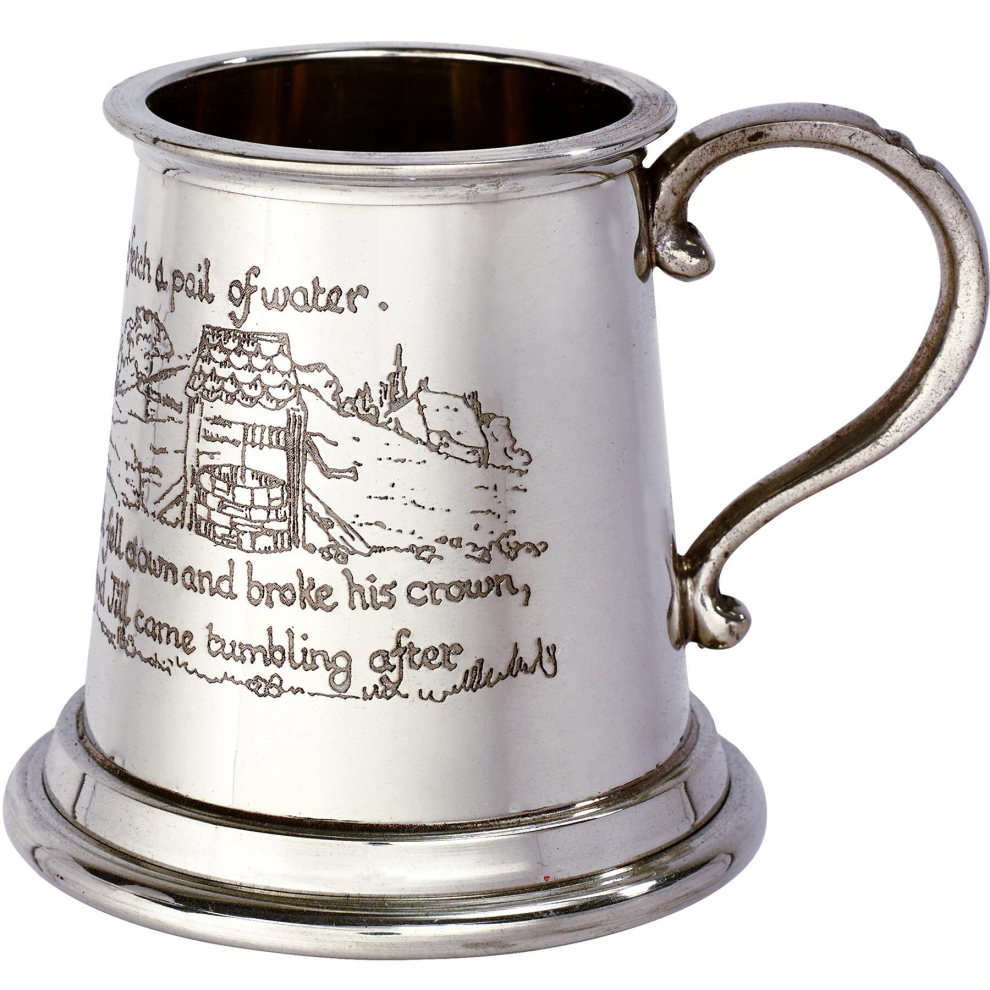 Quarter Pint Mug Jack and Jill Nursery Rhyme on Front and Back of Body Christening Pewter Tankard Scroll Handle