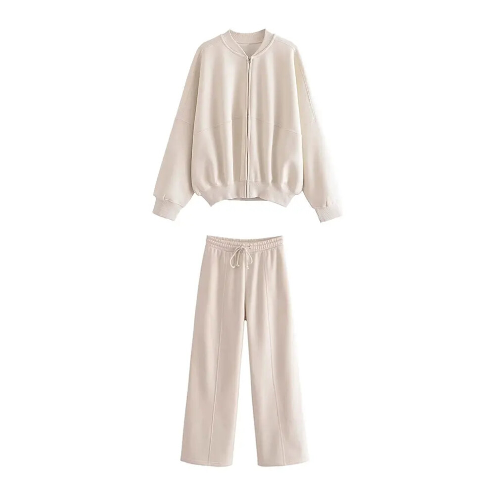 (beige suit, M) HH Women Solid Pant Sets Zipper Long Sleeve Coat Bomber Jacket + Drawstring High Waist Trousers Fashion Streetwear Suit
