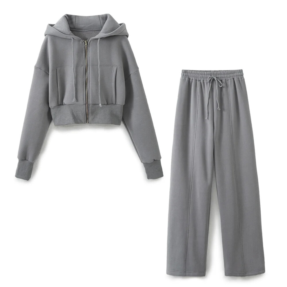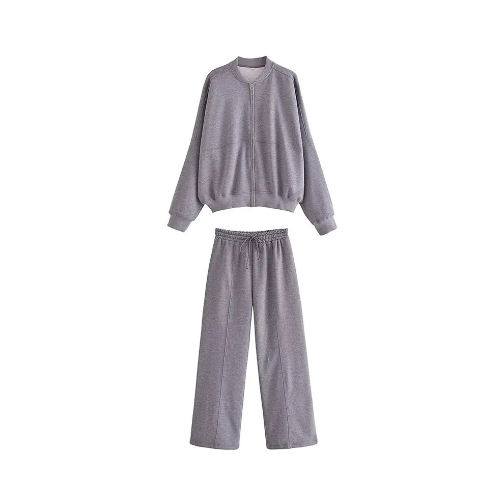 (grey suit, M) HH Women Solid Pant Sets Zipper Long Sleeve Coat Bomber Jacket + Drawstring High Waist Trousers Fashion Streetwear Suit