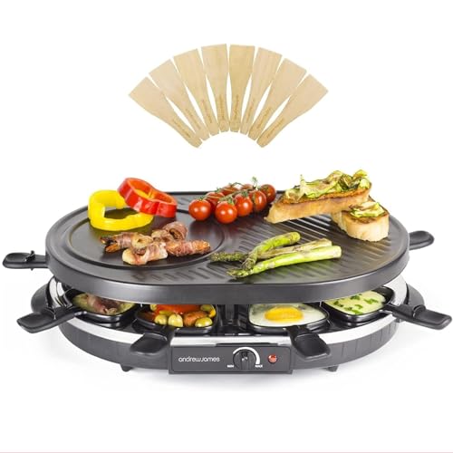 Andrew James 8 Person Traditional Raclette Grill with 8 Pans & Spatulas | Adjustable 1200W Thermostatic Control | Easy Clean Non-Stick Surfaces | Perfect for Parties and Indoor Use