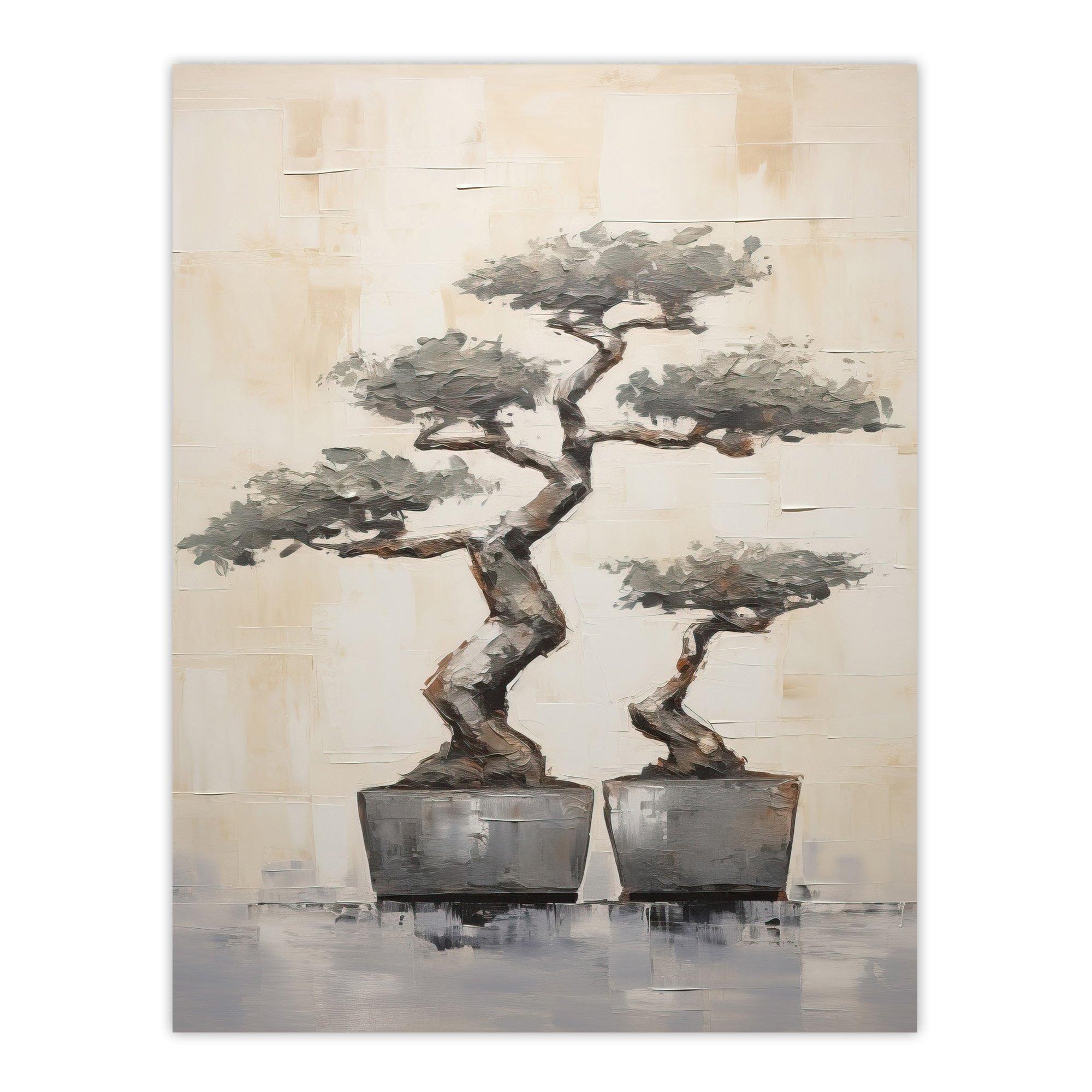 Japan Bonsai Trees Oil Painting Pallet Knife Neutral Grey Tone Textured Artwork Art Print Framed Poster Wall Decor