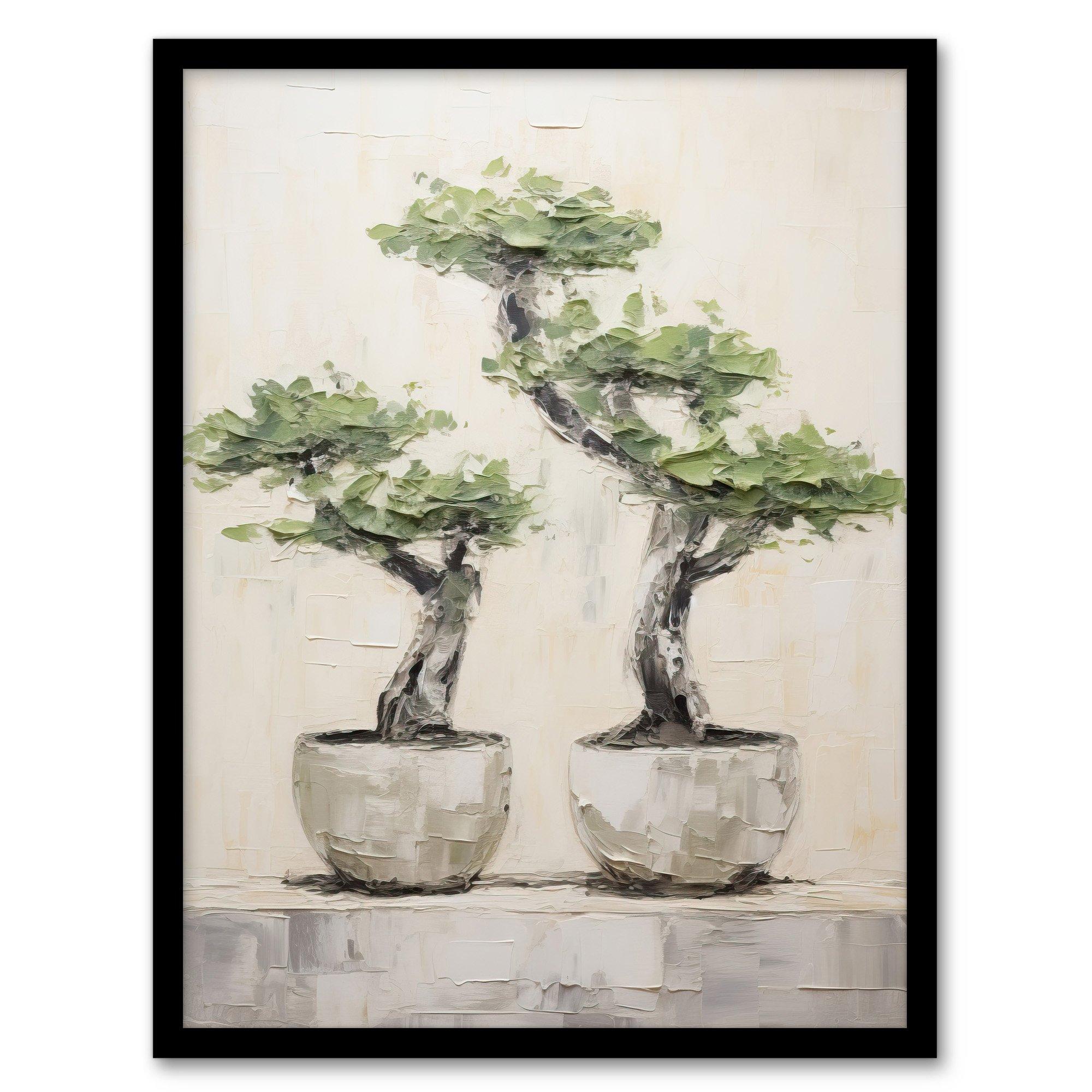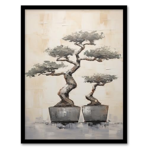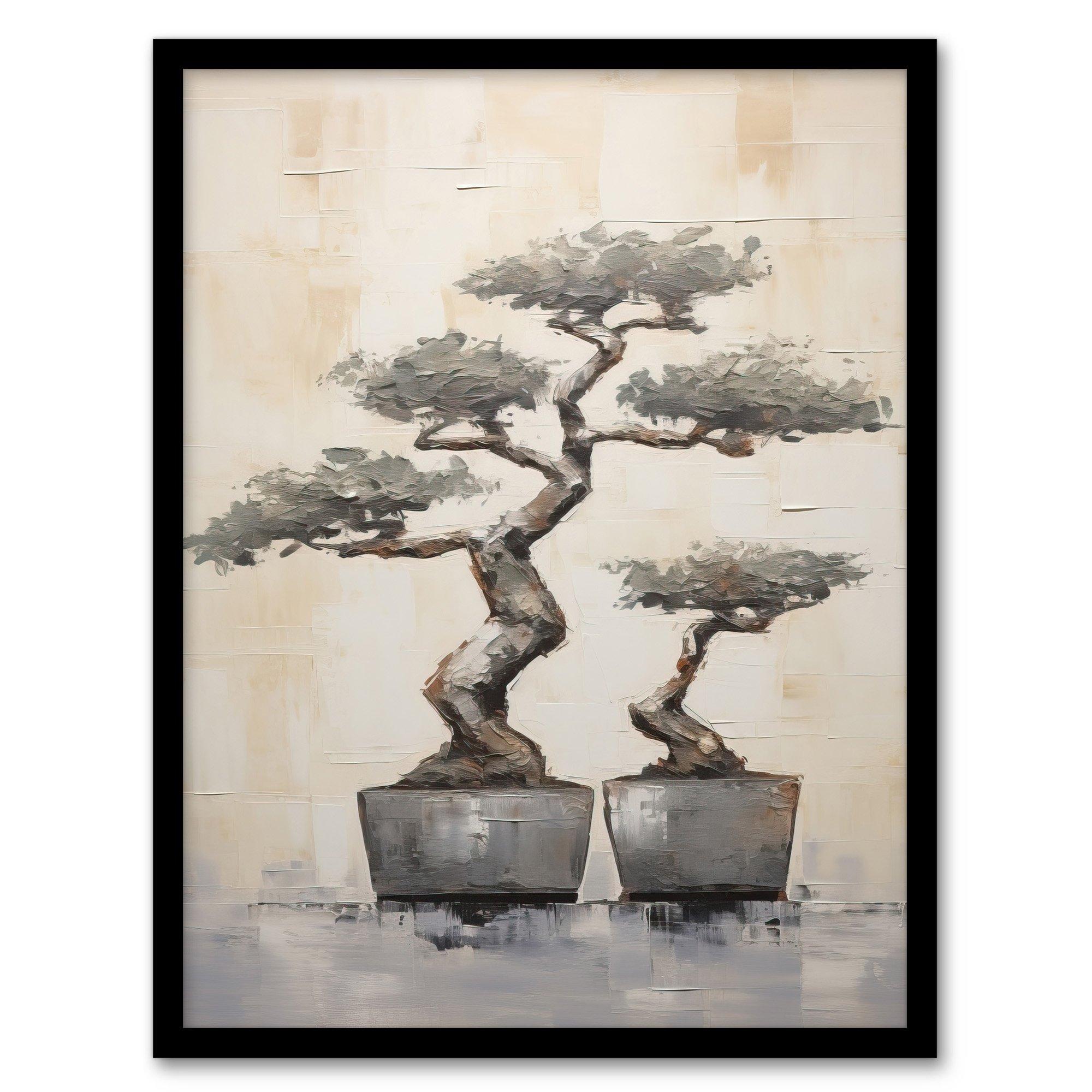 Artery8 Japan Bonsai Trees Oil Painting Pallet Knife Neutral Grey Tone Textured Artwork Artwork Framed Wall Art Print A4
