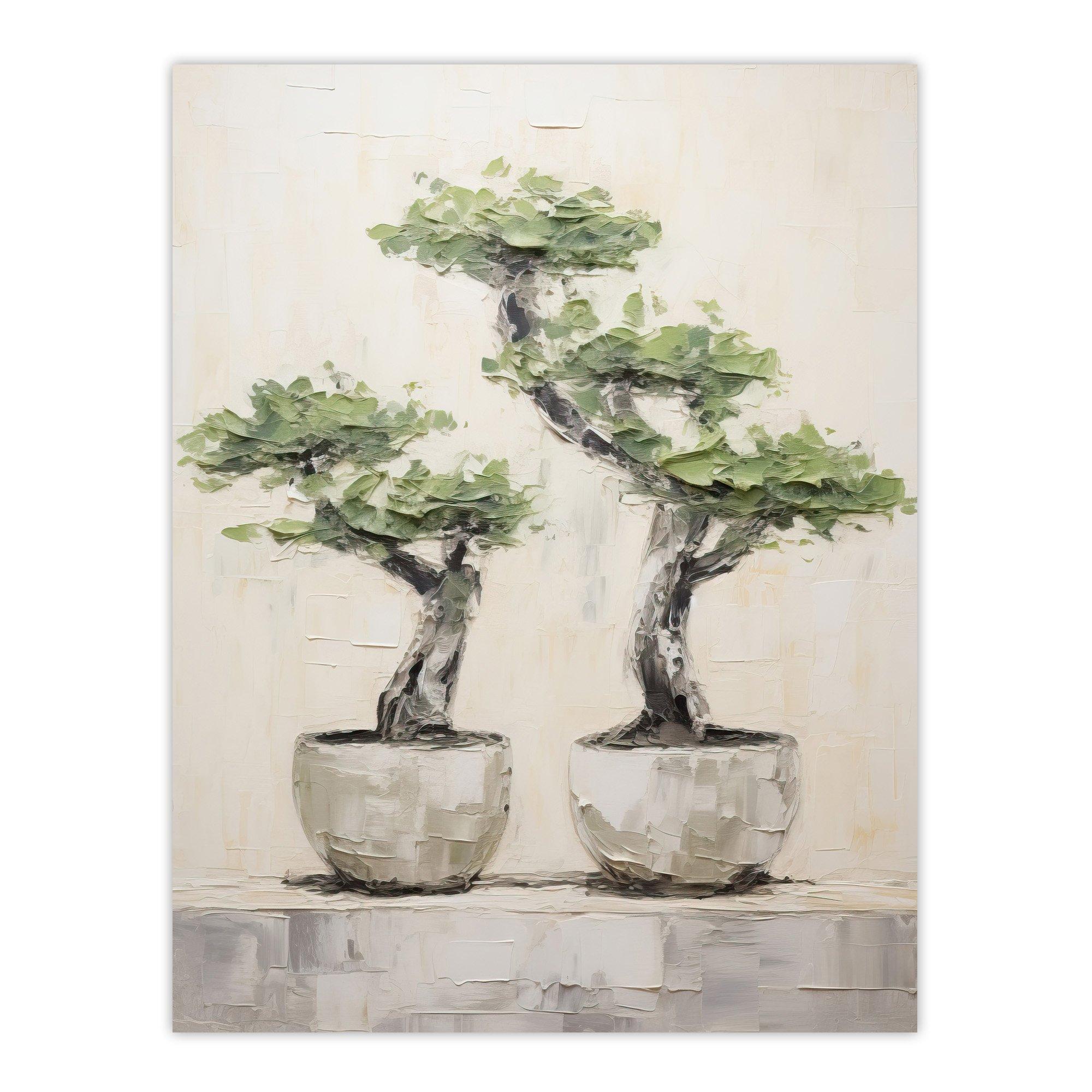 Japan Bonsai Trees In Pots Oil Painting Pallet Knife Neutral Tone Textured Tree Artwork Art Print Framed Poster Wall Decor