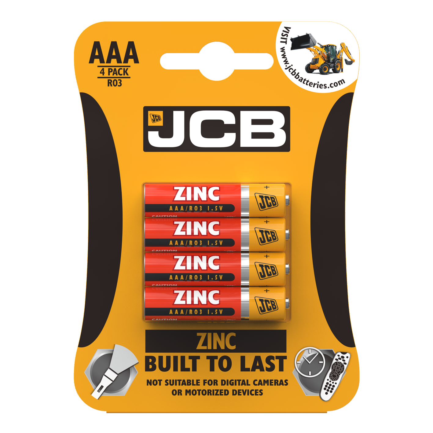 Pack of 4 JCB AAA Zinc Batteries Ideal for Clocks Toys and Small Appliances