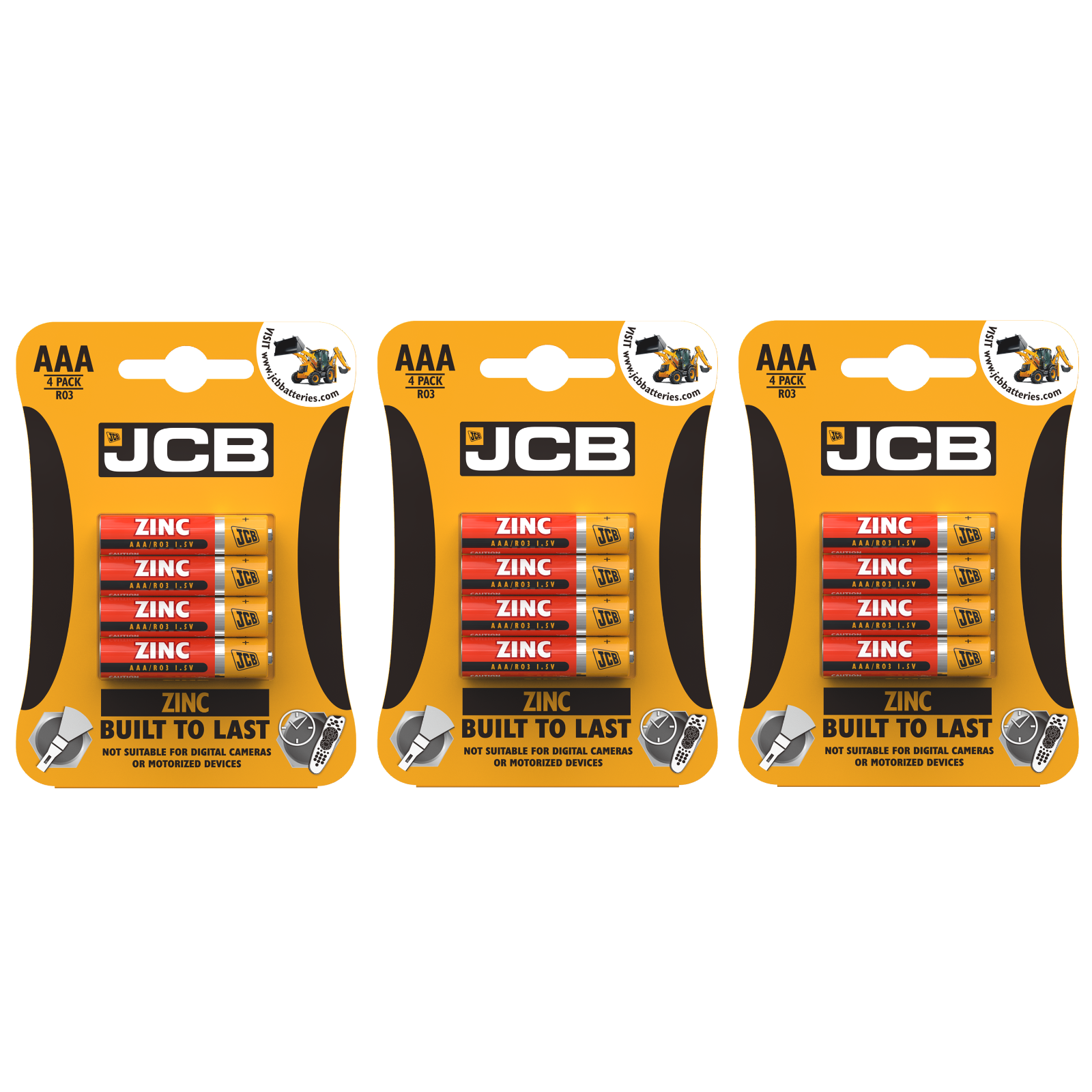 Pack of 12 JCB AAA Zinc Batteries Ideal for Clocks Toys and Small Appliances