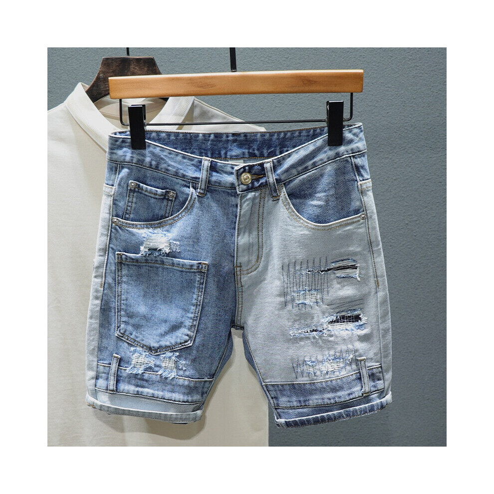 Slim Straight Jeans Shorts Men Personality Pocket Mixed Stitching Patch Ripped Hole Denim Shorts Male Streetwear