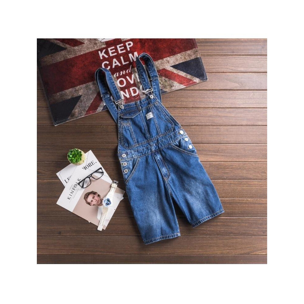 Men\'s patch pocket knee length shorts bib overalls Casual slim denim suspenders jumpsuits Jeans