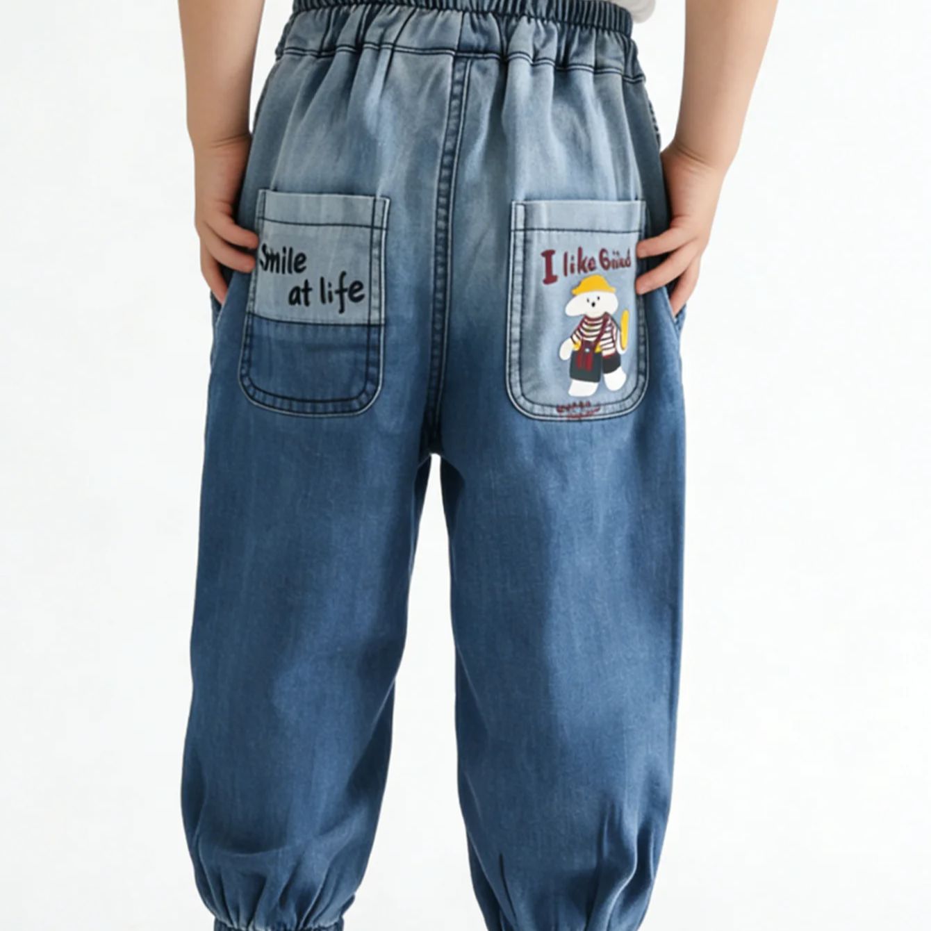 Toddler Boy Gradient Denim Jogger Pants, Elastic Waist Cartoon Patch Pocket Jeans, Casual Loose Fit Trousers For Kids Spring Fal