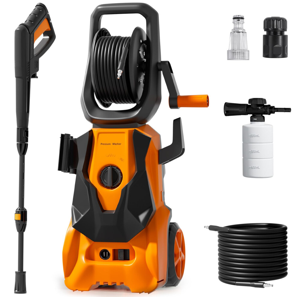 Pressure Washers 1800W,140Bar, Jet Washers Pressure Washers with Hose Reel Adjustable Nozzles & Foam Tank Power Cord, Power Washer for Yard, Cars,