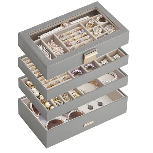 SONGMICS Stackable Jewellery Trays, 4-Tier Jewellery Box, Large Jewellery Case, Clear Glass Lid, 17 x 28 x 18.3 cm, for Dressing Table, Gift Idea, Dove Gray JBC164G01