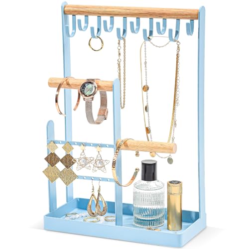 ProCase Jewellery Organiser Jewellery Stand Holder, 4 Tiers Jewelry Stands Necklace Organizer Earring Holder, 10 Hooks Jewelry Tower Display Rack for Bracelets Watches Rings Gifts for Women -Blue
