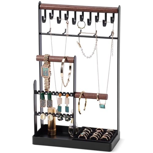 ProCase Jewellery Organiser Jewellery Stand Holder, 4 Tiers Jewelry Stands Necklace Organizer Earring Holder, 10 Hooks Jewelry Tower Display for Bracelets Watches Rings Gifts for Women -Black
