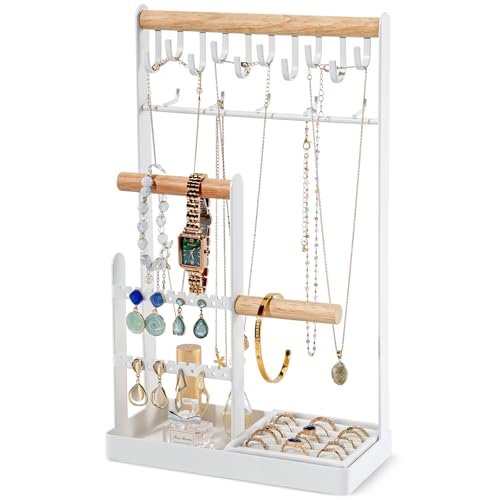 ProCase Jewellery Organiser Jewellery Stand Holder, 4 Tiers Jewelry Stands Necklace Organizer Earring Holder, 10 Hooks Jewelry Tower Display for Bracelets Watches Rings Gifts for Women -White