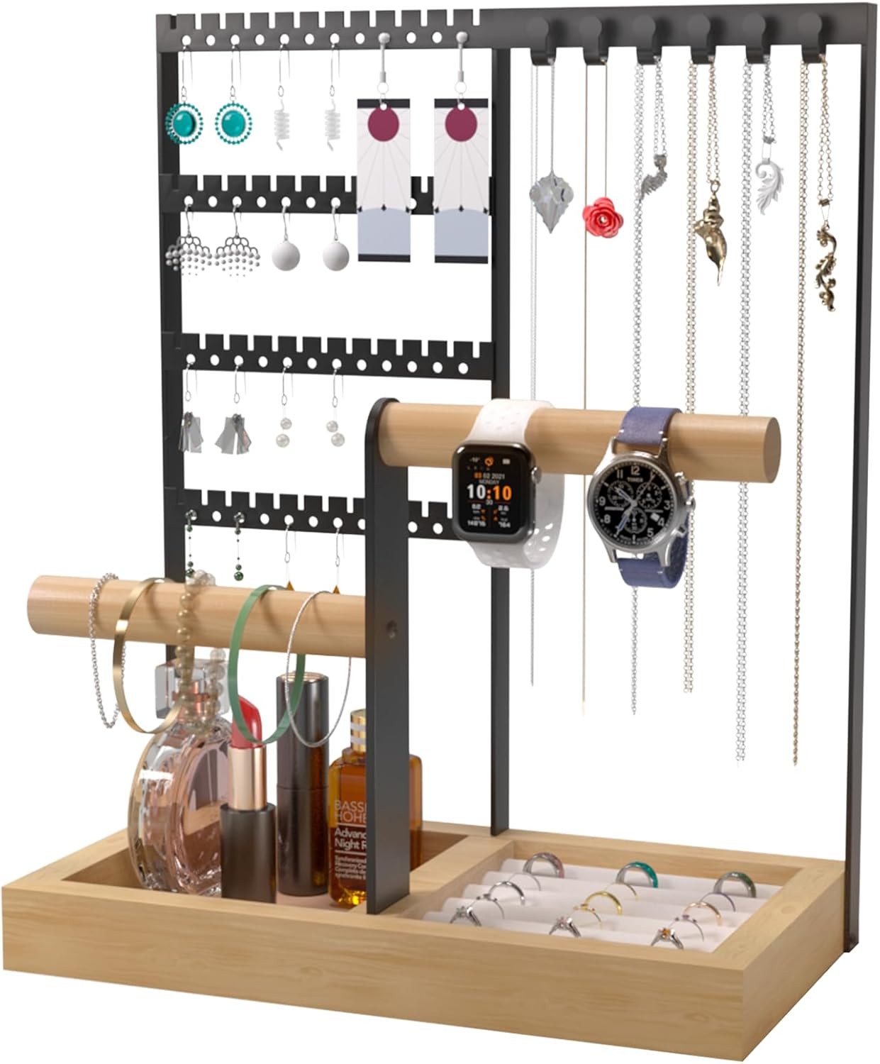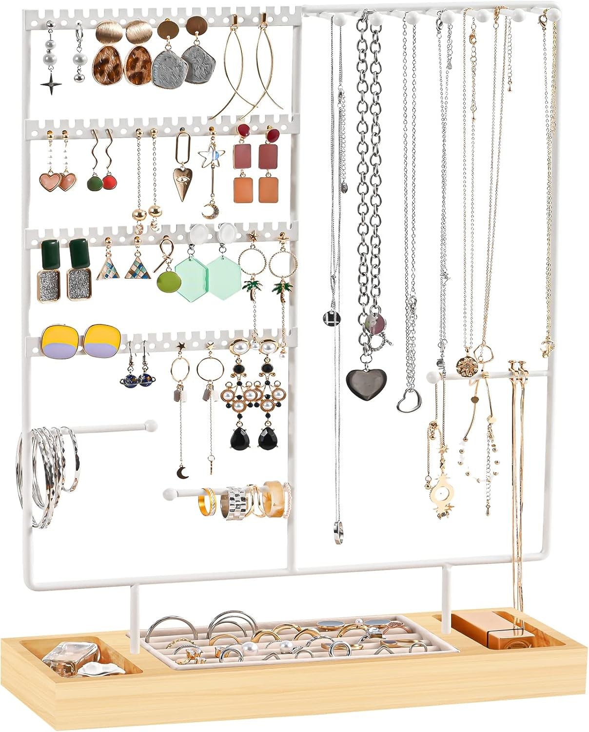 4-Tier Jewellery Organiser Stand – Earring Necklace Holder with Wooden Tray
