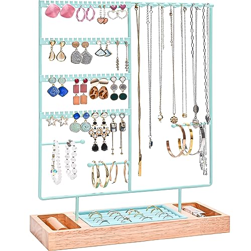 ProCase Jewellery Organiser Stand Earring Holder, 144 Holes Stud Earring Display Rack Necklace Storage Tower with Removable Wood Ring Tray for Necklaces Earrings Bracelets Rings -Blue